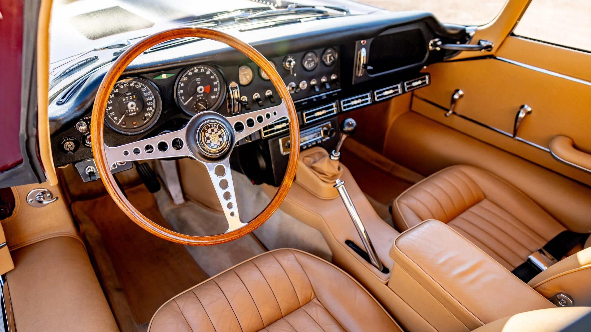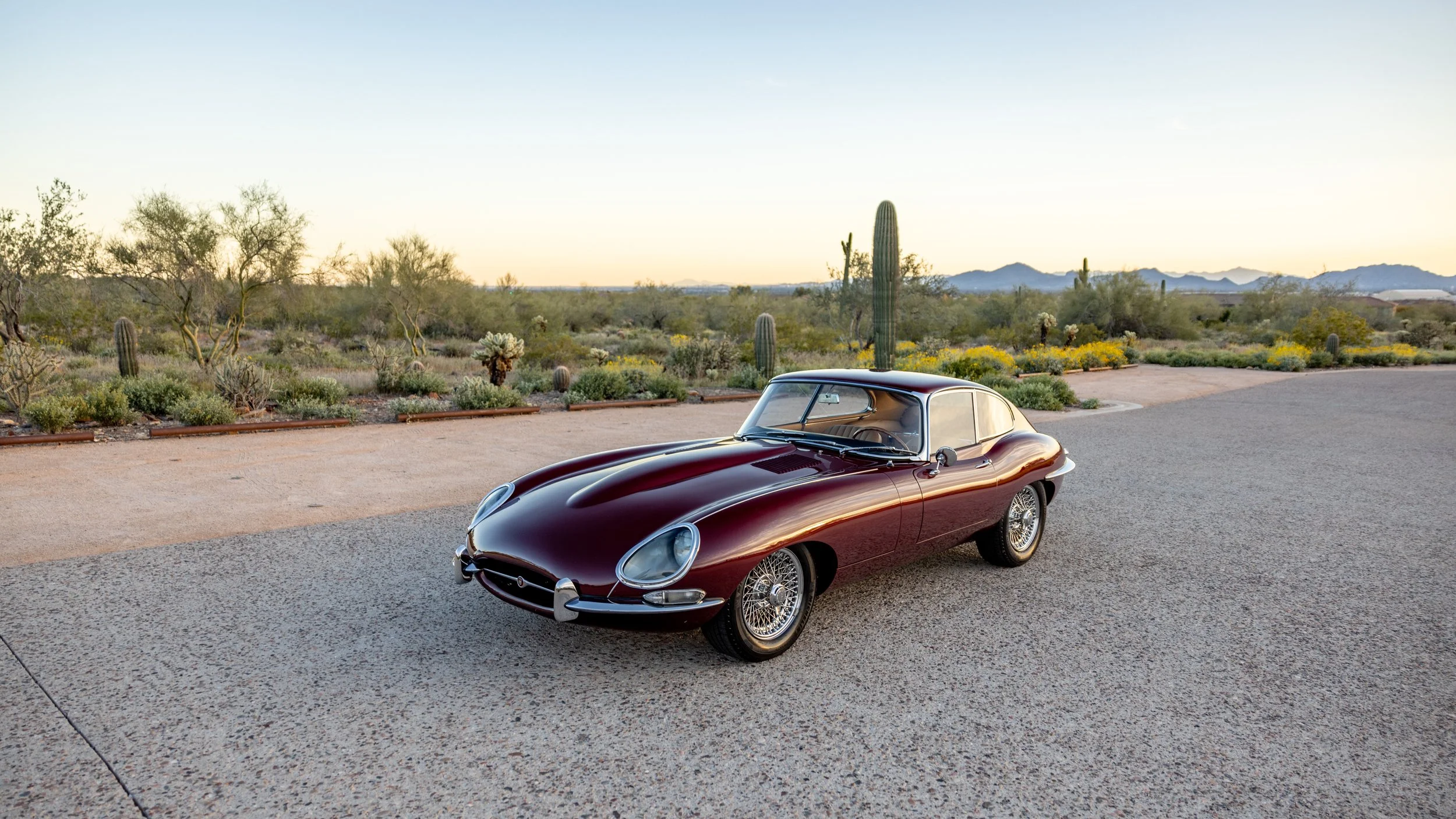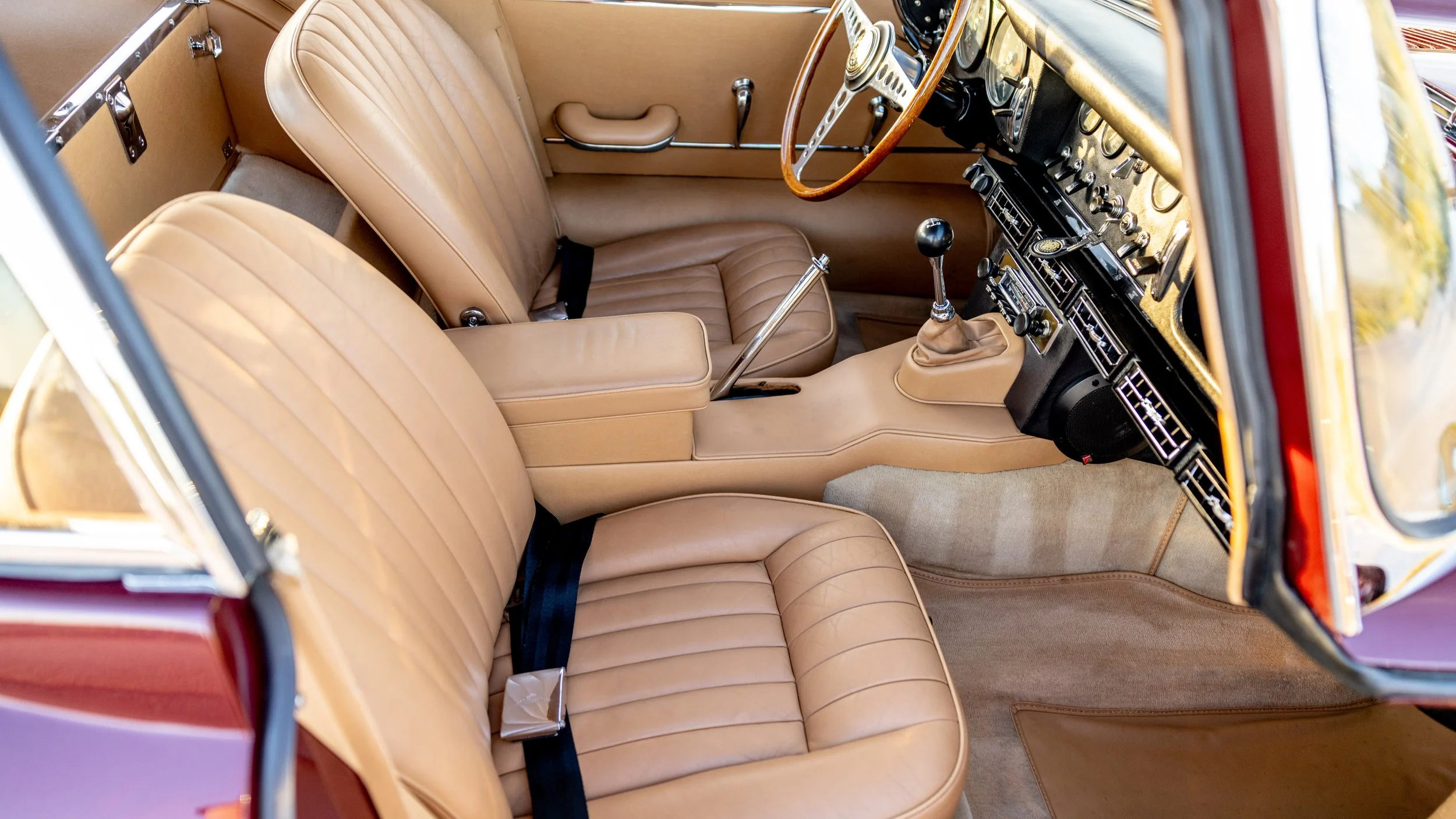 Presented in its original exterior color of Opalescent Maroon over a beautiful beige leather interior, this Jaguar is a highly complete and well-serviced example. This E-Type is accompanied by its maintenance and restoration records, tools, and owner’s manual. This beautiful E-type offers a spectacular opportunity for any new owner whether it will be driven or simply admired as a part of any discerning collection.