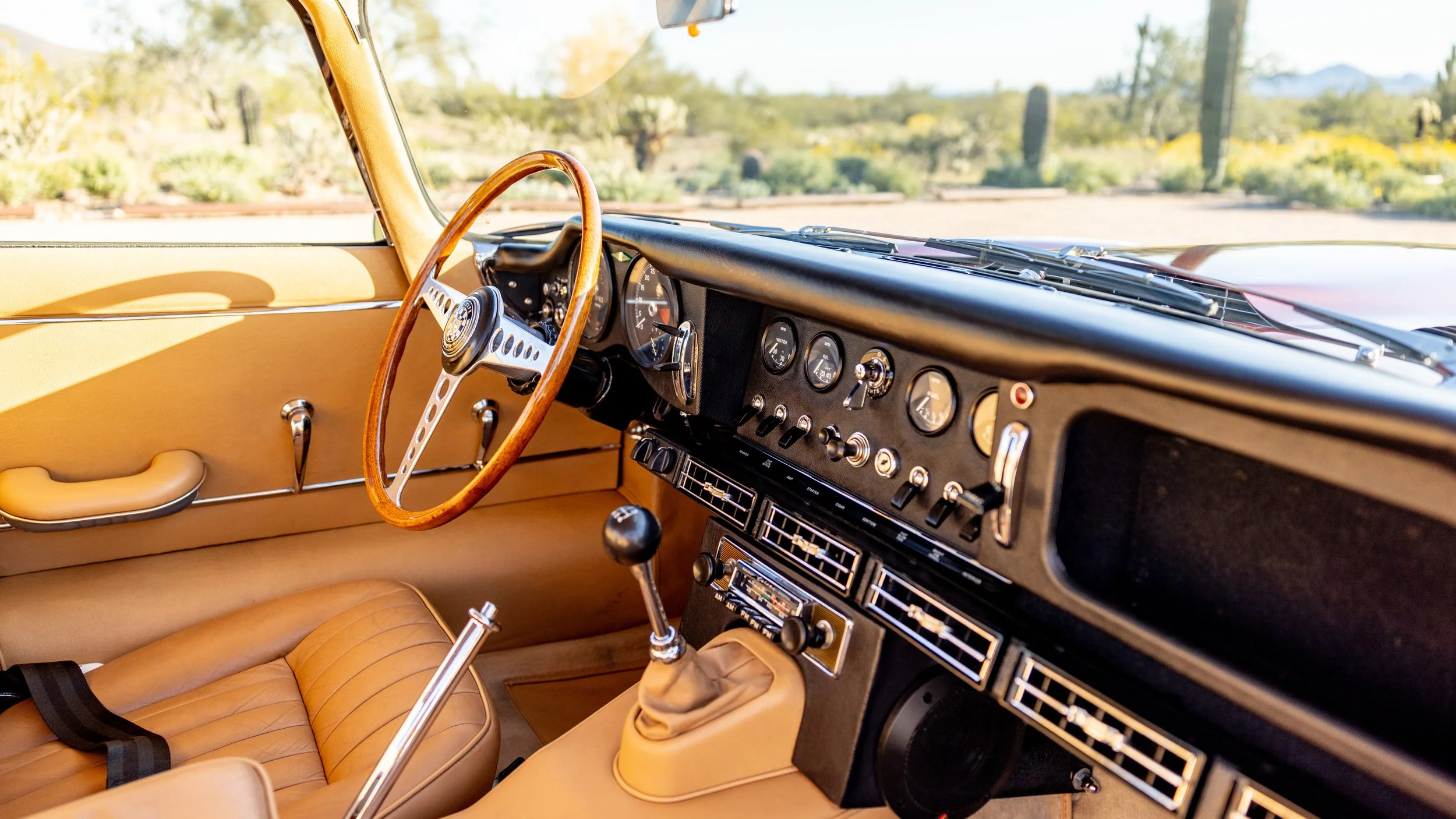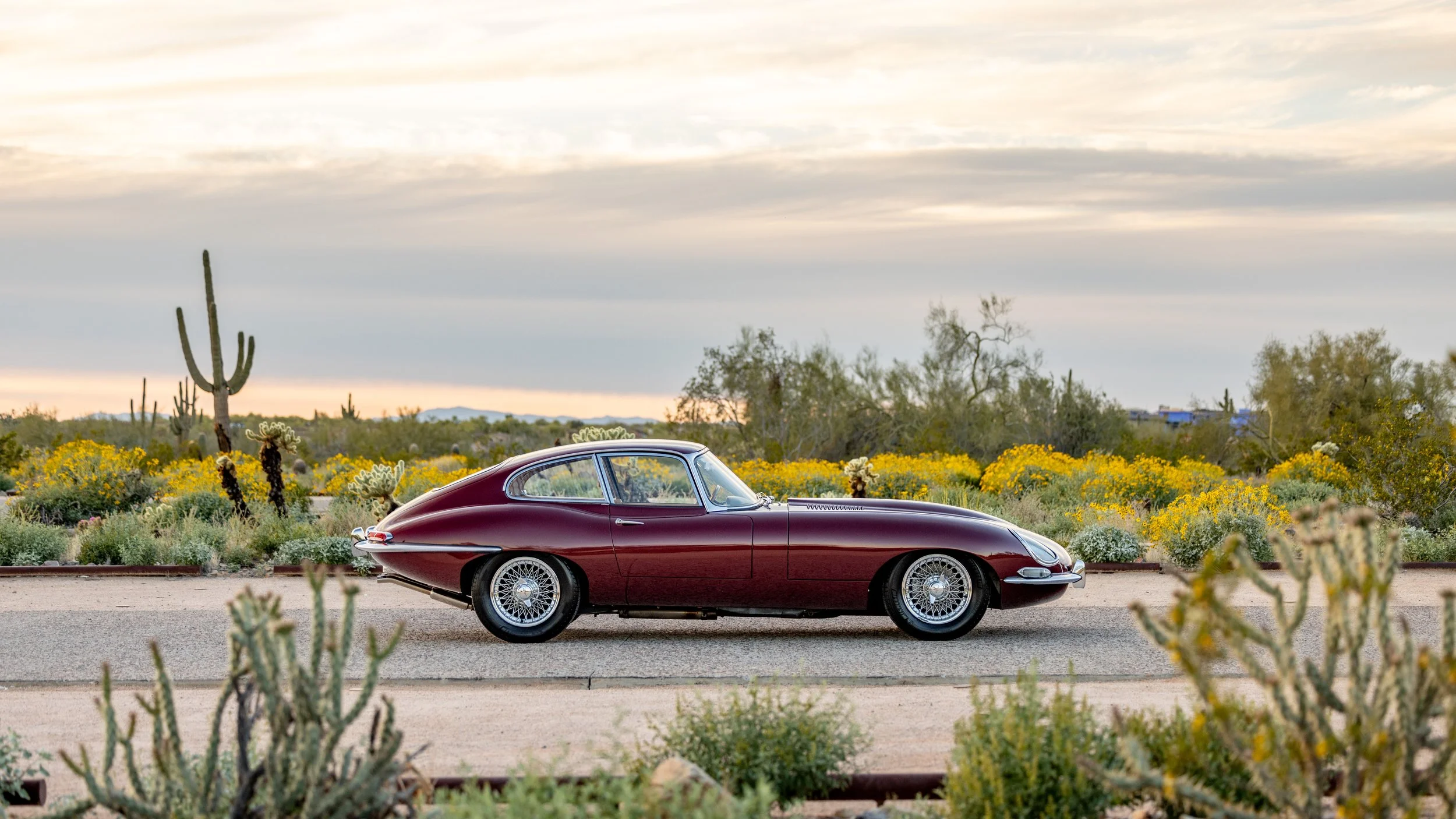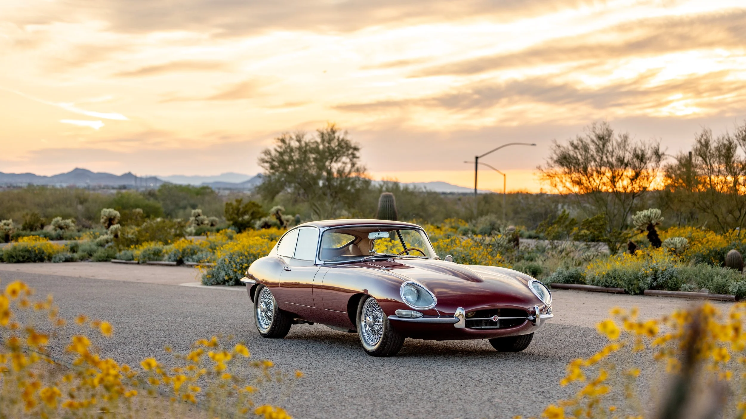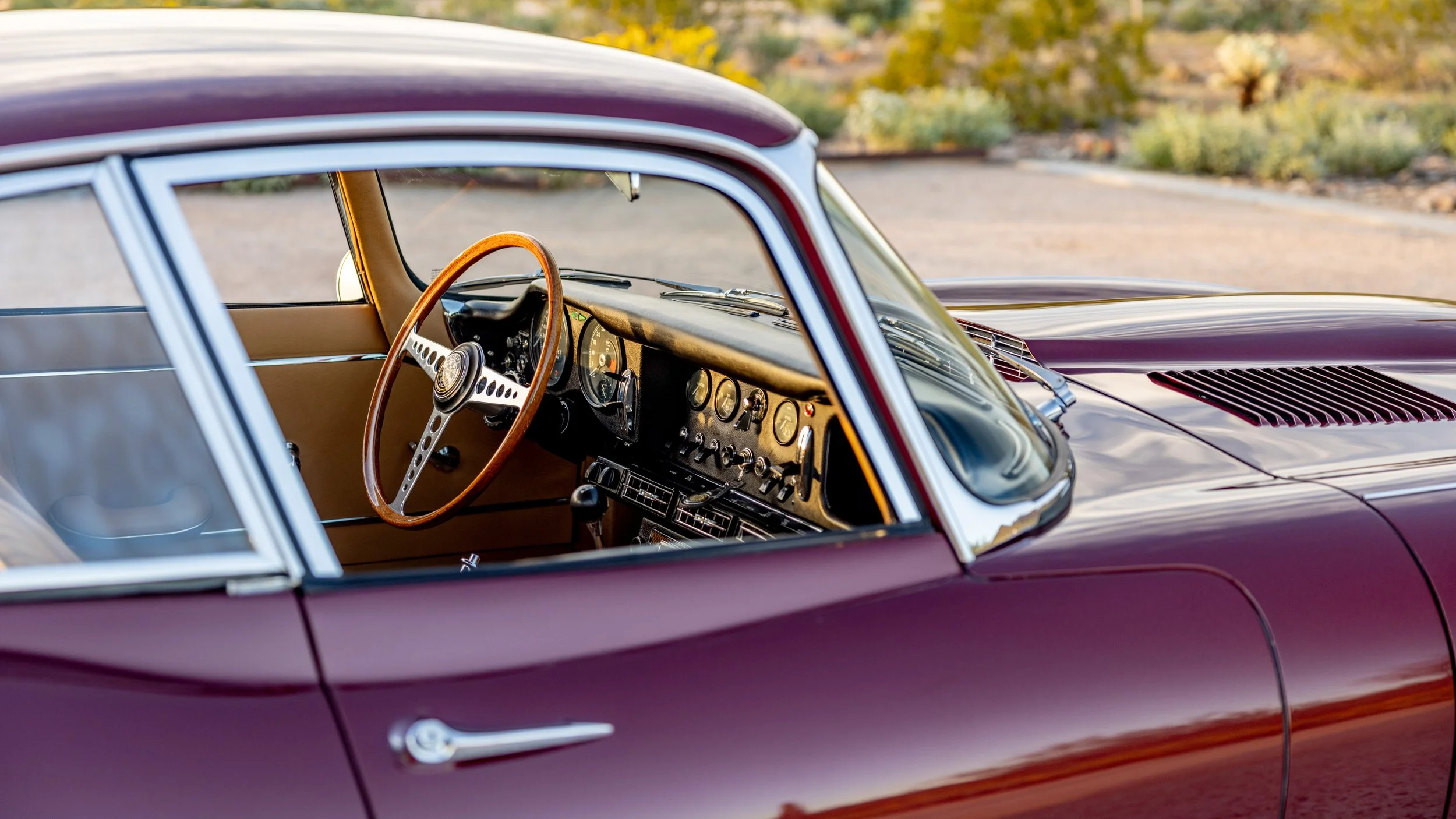 Presented in its original exterior color of Opalescent Maroon over a beautiful beige leather interior, this Jaguar is a highly complete and well-serviced example. This E-Type is accompanied by its maintenance and restoration records, tools, and owner’s manual. This beautiful E-type offers a spectacular opportunity for any new owner whether it will be driven or simply admired as a part of any discerning collection.