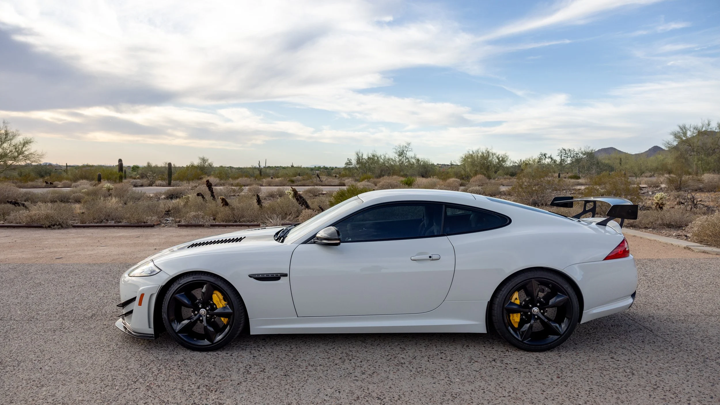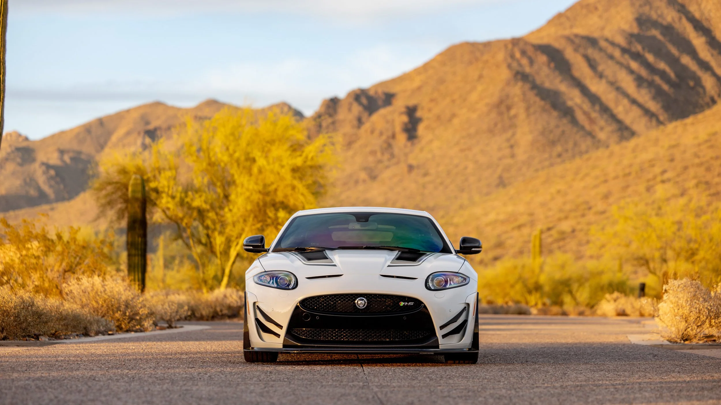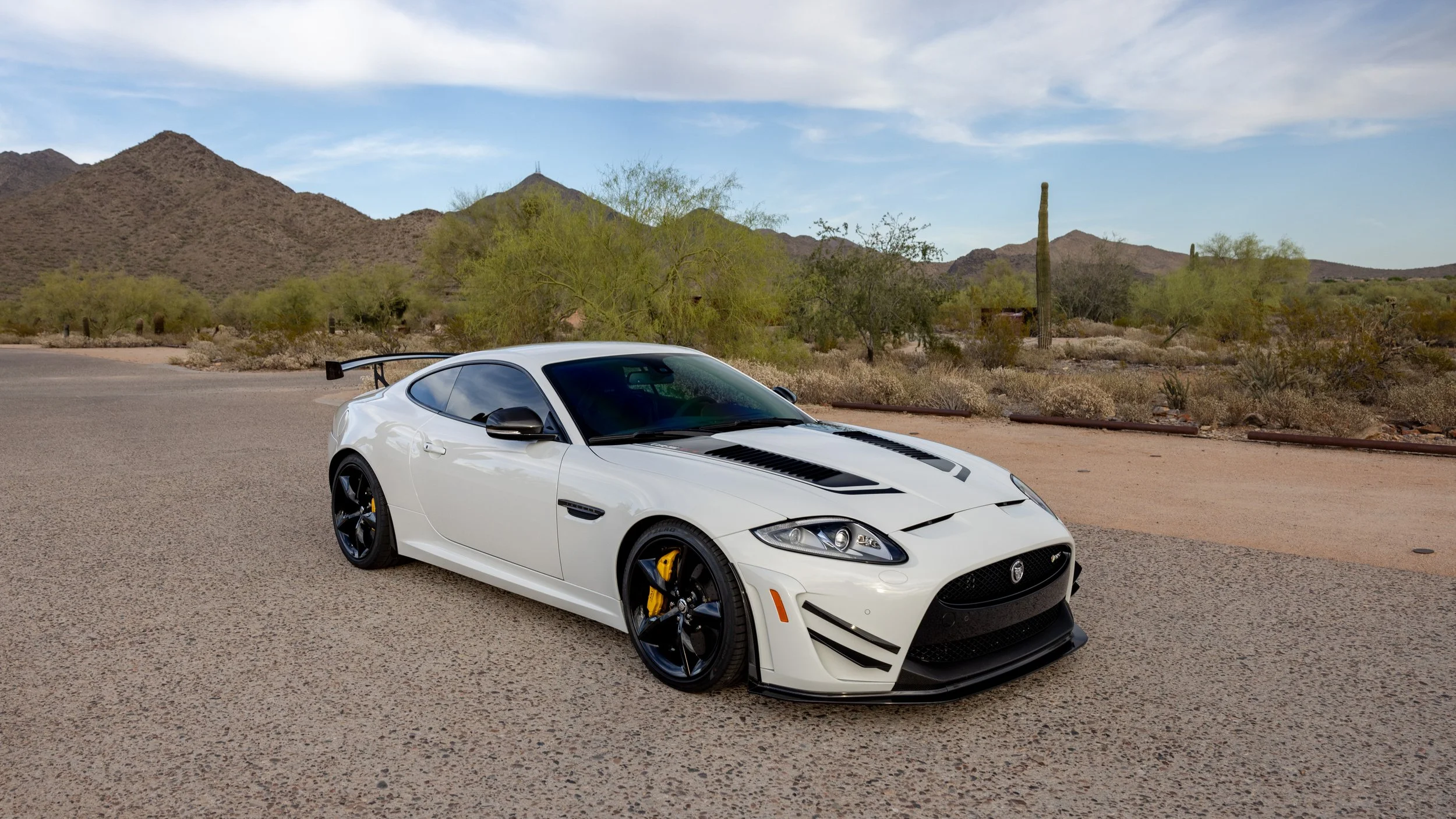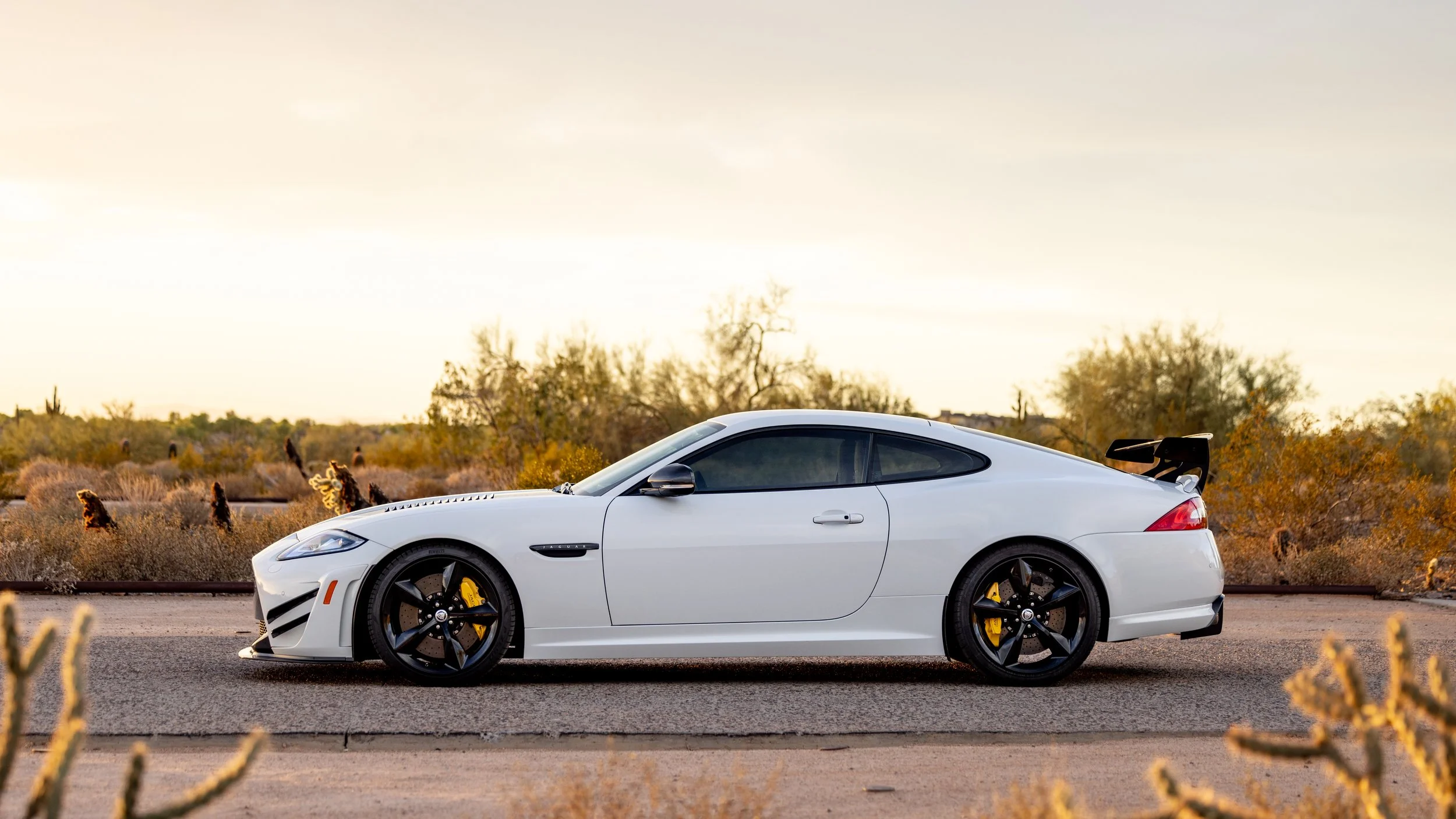 Some cars are built for the road, and a select few feel as though they were shaped by the track first. This 2014 Jaguar XKR-S GT falls firmly into the latter category, presented in a striking white over black configuration with just 3,645 miles. Its presence is immediately defined by an extensive carbon fiber aero package that extends across the exterior, giving the car a purposeful, engineered look that reflects its limited-production intent. Every angle communicates precision and restraint, blending Jaguar’s grand touring heritage with a sharper, more focused edge.
