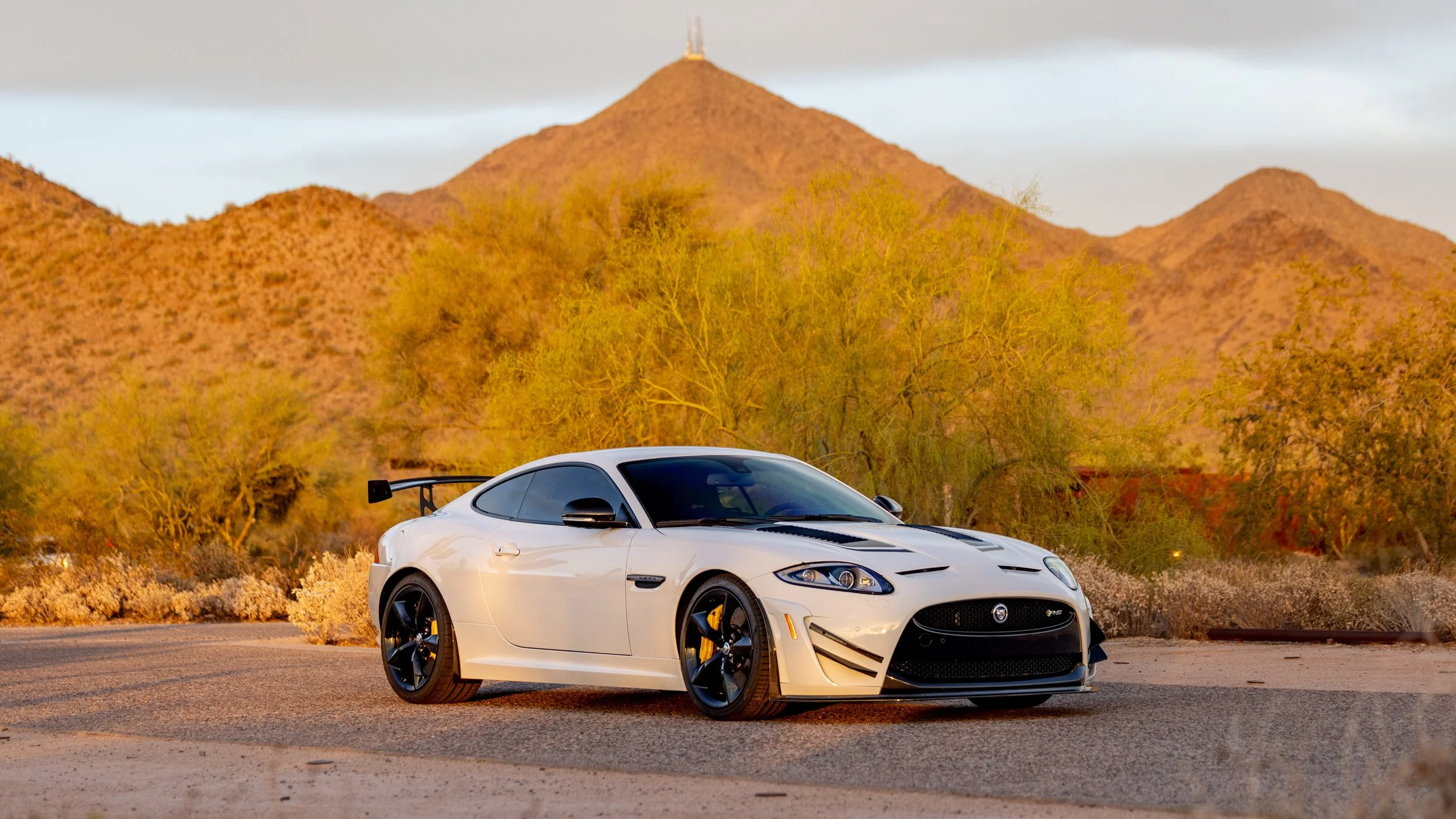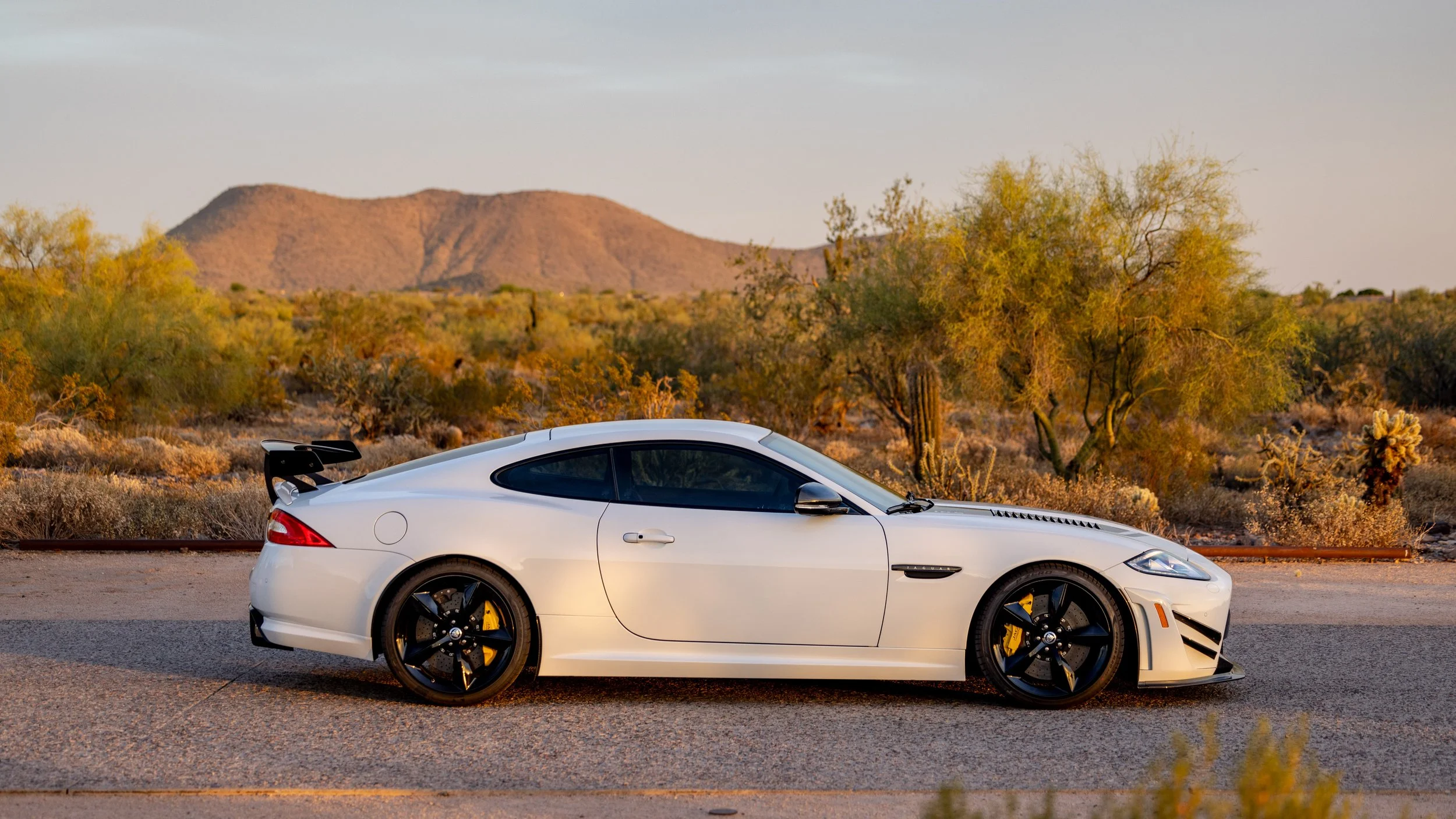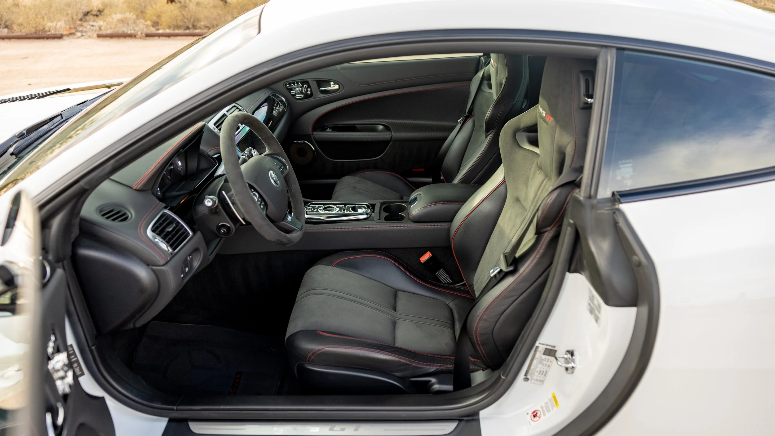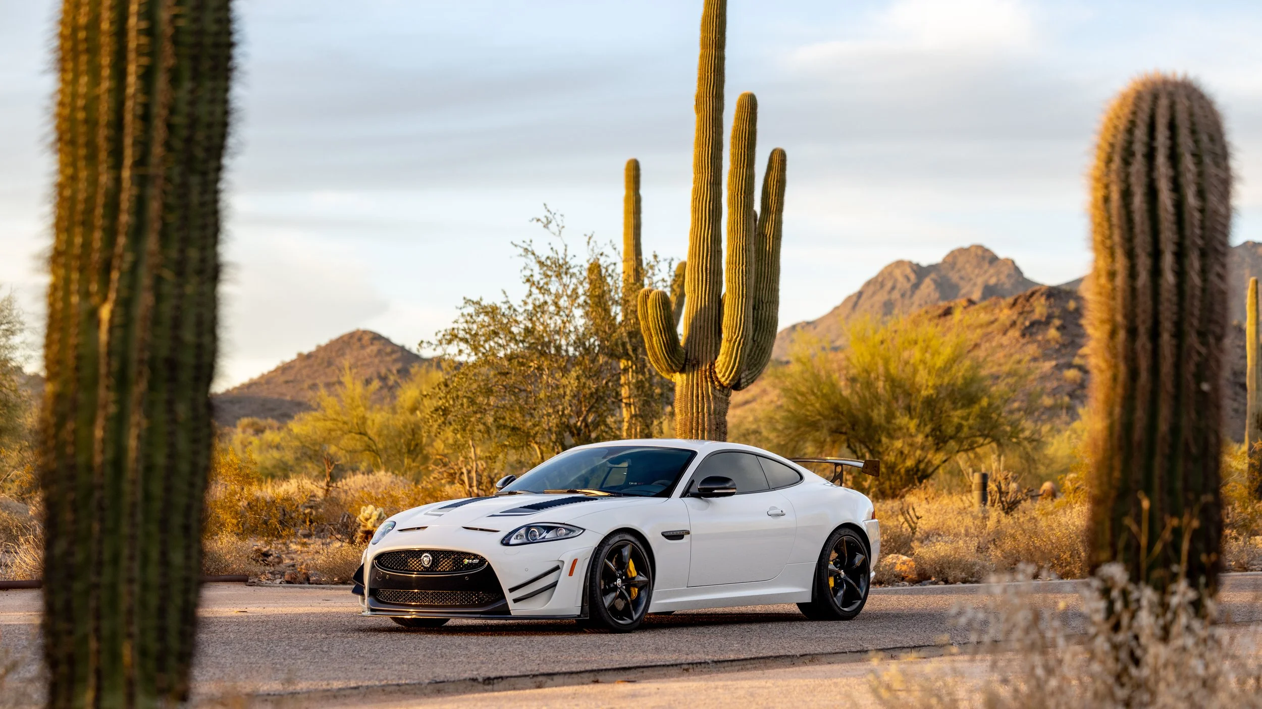 Some cars are built for the road, and a select few feel as though they were shaped by the track first. This 2014 Jaguar XKR-S GT falls firmly into the latter category, presented in a striking white over black configuration with just 3,645 miles. Its presence is immediately defined by an extensive carbon fiber aero package that extends across the exterior, giving the car a purposeful, engineered look that reflects its limited-production intent. Every angle communicates precision and restraint, blending Jaguar’s grand touring heritage with a sharper, more focused edge.