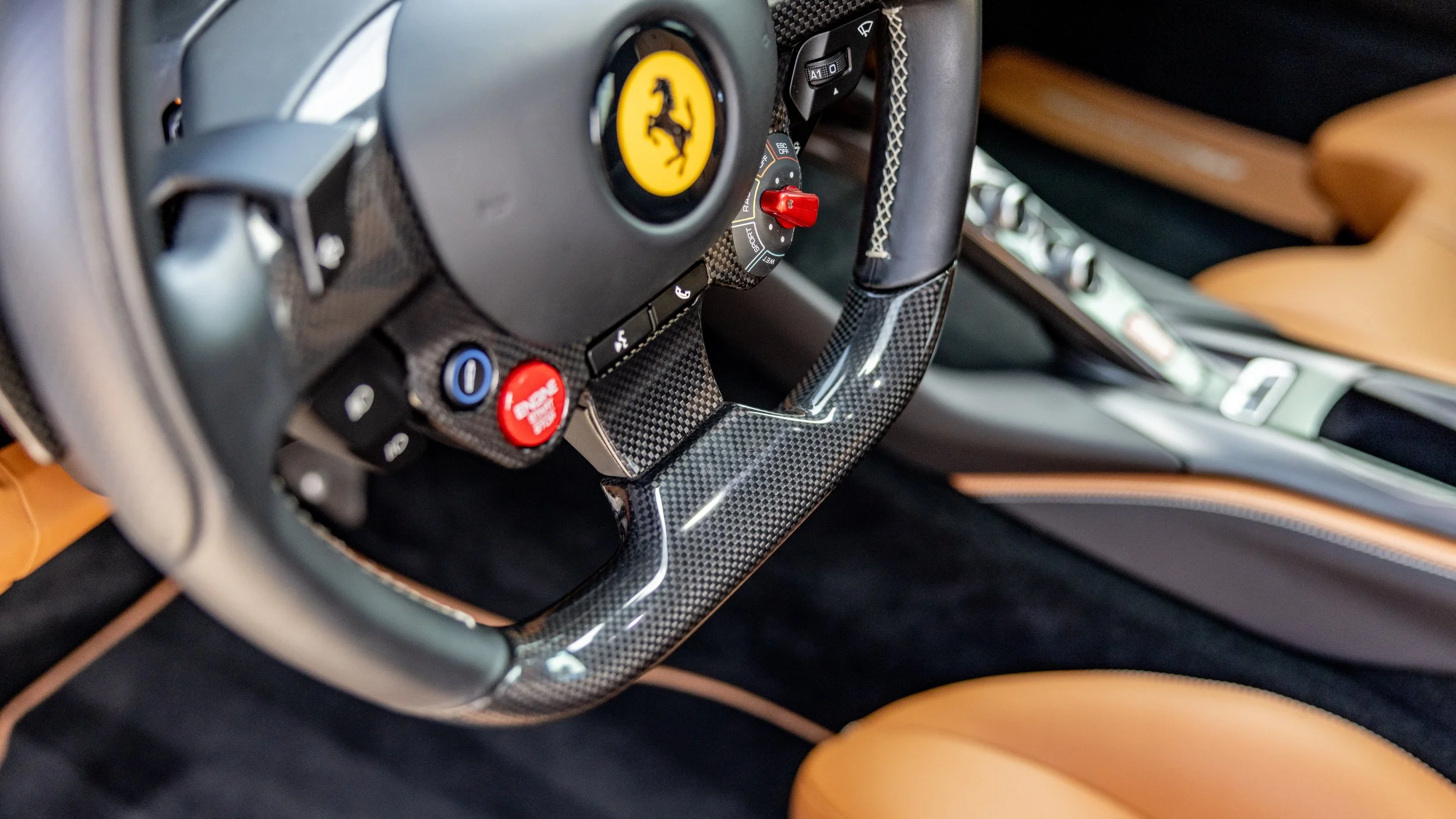 Inside, the Cuoio leather interior is a perfect blend of luxury and race-inspired functionality. Carbon fiber racing seats, equipped with a seat lifter, provide a secure yet comfortable driving position, complemented by an aluminum rev counter and Nero Cavallino-stitched headrests. Carbon fiber continues throughout the cabin, enhancing the central bridge and various trim elements, reinforcing the car’s lightweight performance ethos. Additionally, Grigio Chiaro special stitching and a suite of modern conveniences—including satellite radio and a parking camera—round out this meticulously optioned build. This 812 Superfast isn’t just about raw power; it’s a statement of precision, craftsmanship, and exclusivity. With its breathtaking design and formidable performance, this is the Ferrari that leaves a lasting impression long after the engine is switched off